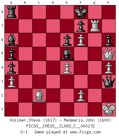 Last move : 0-1 2011 May 25 10:45:37 [Event "FICGS__CHESS__CLASS_C__000172"] [Site "FICGS"] [Date "2011.03.14"] [Round "1"] [White "Vollmer,Steve"] [Black "Medearis,John"] [Result "0-1"] [WhiteElo "1617"] [BlackElo "1600"] 1.e4 c5 2.Nf3 e6 3.d4 cxd4 4.Nxd4 a6 5.c4 Qc7 6.Nc3 Nf6 7.Bd3 Bd6 8.Qf3 O-O 9.Bg5 Be5 10.Nde2 Nc6 11.a3 Re8 12.h4 h6 13.Bf4 d5 14.O-O dxc4 15.Bxc4 Nd4 16.Nxd4 Bxf4 17.Ba2 Rd8 18.Rfd1 Bh2 19.Kh1 Be5 20.Nde2 Bd7 21.Rac1 Bc6 22.Bb1 Qb6 23.b4 a5 24.b5 Bxb5 25.Bc2 Bc4 26.Na4 Qc6 27.g4 Rxd1 28.Rxd1 Bb5 29.Nec3 Ba6 30.g5 b5 31.Rg1 bxa4 32.gxf6 Qxc3 33.Rxg7+ Kf8 34.Qh5 Qh3+ 0-1 Sicilian : Kan, Maroczy bind (Reti variation) Kingside Castling by player Black (move 8) Kingside Castling by player White (move 14) Player Black won this chess game. Follow this game move after move (download)Chess is a matter of delicate judgment, knowing when to punch and how to duck. (Bobby Fischer) Ein Gewinn durch eine ungenaue Kombination, sei sie auch noch so vorzeigbar, erfüllt mich mit Schaudern. (Wilhelm Steinitz) Observen a Garry Kasparov. Después de una derrota, invariablemente el gana la próxima partida. Prácticamente hace pedazos a su siguiente oponente. Eso es algo que tenemos que aprender a lograr. (Maurice Ashley) Je menace de comprendre la position. (Anonyme) There is no instance of a country having benefited from prolonged warfare. (Sun Tzu)
