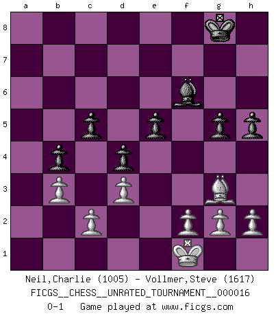 Last move : 0-1 2011 April 26 10:0:19 [Event "FICGS__CHESS__UNRATED_TOURNAMENT__000016"] [Site "FICGS"] [Date "2011.03.18"] [Round "1"] [White "Neil,Charlie"] [Black "Vollmer,Steve"] [Result "0-1"] [WhiteElo "1005"] [BlackElo "1617"] 1.e4 e5 2.Nf3 Nc6 3.Bb5 a6 4.Ba4 Nf6 5.d3 b5 6.Bb3 Be7 7.a4 Bb7 8.axb5 axb5 9.Rxa8 Bxa8 10.Be3 O-O 11.Nc3 b4 12.Nd5 Nd4 13.Nxf6+ Bxf6 14.Nxd4 exd4 15.Bd2 c5 16.O-O d5 17.exd5 Bxd5 18.Bxd5 Qxd5 19.b3 Re8 20.Re1 Rxe1+ 21.Qxe1 Qe6 22.Qxe6 fxe6 23.Bf4 e5 24.Bg3 g5 25.Kf1 h5 0-1 Ruy Lopez : Anderssen variation Kingside Castling by player Black (move 10) Kingside Castling by player White (move 16) Player Black won this chess game. Follow this game move after move (download)Of Chess it has been said that life is not long enough for it, but that is the fault of life, not Chess. (William Ewart Napier) Ich verachte die Medien. (Robert James Fischer) Yo adoro todas la posiciones. Denme una partida posicional difícil, y la jugaré. Pero posiciones totalmente ganadas, no las tolero. (Hein Donner) Vous savez, camarade Pachman, je n'éprouve pas de plaisir à être ministre, je jouerais plutôt aux échecs comme vous, ou alors ferais une révolution au Venezuela. (Che Guevara à Ludek Pachman, 'Checkmate in Prague', 1975) When I took office, only high energy physicists had ever heard of what is called the World Wide Web... Now even my cat has its own page. (Bill Clinton, 1996)