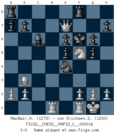 Last move : 1-0 2007 January 10 2:23:37 [Event "FICGS__CHESS__RAPID_C__000016"] [Site "FICGS"] [Date "2006.12.14"] [Round "1"] [White "MacNair,Adrian"] [Black "von Erichsen,Svante Carl"] [Result "1-0"] [WhiteElo "1273"] [BlackElo "1200"] 1.e4 c5 2.c3 Nc6 3.Nf3 d6 4.Bc4 g6 5.Ng5 Ne5 6.Bb3 Bh6 7.d4 cxd4 8.cxd4 f6 9.dxe5 Bxg5 10.Bxg5 fxg5 11.Qf3 e6 12.O-O dxe5 13.Nc3 Nf6 14.Rad1 Qe7 15.Nb5 O-O 16.Nd6 Bd7 17.Qd3 Bc6 18.Qc4 Kg7 19.Qc5 Nxe4 20.Nf5+ Kf6 21.Qxe7+ 1-0 Sicilian : Alapin's variation (2.c3) Kingside Castling by player White (move 12) Kingside Castling by player Black (move 15) Player White won this chess game. Follow this game move after move (download)I thought the most common mistake [in chess] was the first one: Learning the game :P (Garvin Gray, FICGS forum) Schach ist ein Teil der Kultur, und wenn es mit der Kultur abwärts geht, geht es auch mit dem Schach abwärts. (Mikhail Moiseyevich Botvinik) El Ajedrez es un expediente tonto que hace creer a la gente inactiva que hacen una cosa muy astuta cuando solamente estan perdiendo su tiempo. (George Bernard Shaw) A chaque perte on perd un peu de soi. (Joël Lautier) Don't be irreplaceable, if you can't be replaced, you can't be promoted. (Dan Rotaru)