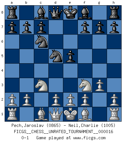 Last move : 0-1 2011 June 2 19:7:49 [Event "FICGS__CHESS__UNRATED_TOURNAMENT__000016"] [Site "FICGS"] [Date "2011.03.18"] [Round "1"] [White "Pech,Jaroslav"] [Black "Neil,Charlie"] [Result "0-1"] [WhiteElo "0865"] [BlackElo "1005"] 1.c4 e5 2.Nc3 Nf6 3.Nf3 Nc6 4.g3 d5 5.cxd5 Nxd5 0-1 This chess game has been lost on time (started : 2011.03.18 18:37:23) English Opening Player Black won this chess game. Follow this game move after move (download)We must make sure that Chess will not be like a dead language, very interesting, but for a very small group. (Sytze Faber) Frage: Was machen Sie mit den Preisen? Anwort: Ich habe Angst, dass meine Freundin davon neue Kleider kauft. (Loek van Wely) Jugadores de primera clase pierden en contra de jugadores de segunda clase porque los jugadores de segunda clase a veces juegan una partida de primer clase. (Siegbert Tarrasch) La conception d'un plan est le processus par lequel un joueur exploite les avantages de sa position tout en s'efforçant d'en réduire au minimum les inconvénients. Afin de garantir le succès, un plan doit toujours se fonder sur un diagnostic objectif des particularités d'une position. La conception d'un plan est d'autant plus difficile que la position est équilibrée, et grandement facilitée lorsqu'il n'existe qu'un seul plan susceptible de répondre aux exigences de la position. (Harry Golombek) The bottom line is always the bottom line. (Johann Piek)