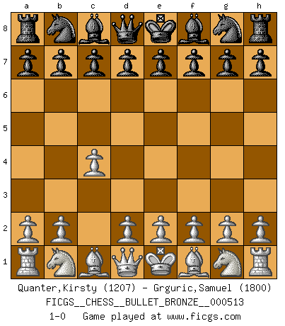 Last move : 1-0 2011 March 24 15:59:55 [Event "FICGS__CHESS__BULLET_BRONZE__000513"] [Site "FICGS"] [Date "2011.03.24"] [Round "1"] [White "Quanter,Kirsty"] [Black "Grguric,Samuel"] [Result "1-0"] [WhiteElo "1207"] [BlackElo "1800"] 1.c4 1-0 This chess game has been lost on time (started : 2011.03.24 15:53:2) English Opening Player White won this chess game. Follow this game move after move (download)Chess, like any creative activity, can exist only through the combined efforts of those who have creative talent, and those who have the ability to organize their creative work. (Mikhail Botvinnik) Wenn ein Kopf und ein Buch zusammenstoßen und es klingt hohl, ist es denn allemal im Buche? (Georg Christoph Lichtenberg) Hay jugadores fuertes y personas amables y yo soy un jugador fuerte. (Bobby Fischer) La guerre est enfant de la passion, la passion est enfant du narcissisme et le narcissisme est l'enfant. (...) Une autre partie ? (Thibault de Vassal) Employ the attack like tactic of defense. (Chinese proverb)