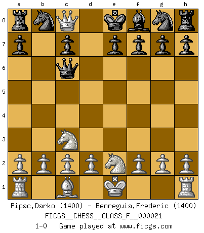 Last move : 1-0 2007 January 7 16:39:45 [Event "FICGS__CHESS__CLASS_F__000021"] [Site "FICGS"] [Date "2006.12.14"] [Round "1"] [White "Pipac,Darko"] [Black "Benreguia,Frederic"] [Result "1-0"] [WhiteElo "1400"] [BlackElo "1400"] 1.e4 d5 2.exd5 Qxd5 3.Nc3 Qe5+ 4.Qe2 Qf5 5.Qb5+ Bd7 6.Qxb7 Qe6+ 7.Be2 Qc6 8.Bf3 Qe6+ 9.Nge2 Bc6 10.Bxc6+ Qxc6 11.Qc8+ 1-0 Scandinavian (centre counter) defense Player White won this chess game. Follow this game move after move (download)Chess is war over the board. The object is to crush the opponents mind. (Bobby Fischer) Wer mein Gambit spielt, muß bereit sein, alle Brücken hinter sich abzubrechen. Es verändert den ganzen Menschen. Es wirkt wie ein Zauberstab und fördert verkümmerte, gute Charakter- eigenschaften wieder zu Tage. (Emil Joseph Diemer) Yo siempre he tenido un ligero sentimiento de lástima por una persona que no tiene conocimiento del Ajedrez. (Siegbert Tarrasch) Je crois qu'il existe des manières très spécifiques de jouer efficacement contre une machine. Evidemment, nous n'avons aucune chance en technique pure, parce que l'ordinateur calcule de manière parfaite. Mais lorsque nous faisons appel à notre cerveau, en utilisant l'intuition et la compréhension, alors nous restons beaucoup plus forts. (Anatoli Karpov) The best teachers teach from the heart, not from the book. (Author unknown)