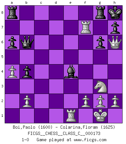 Last move : 1-0 2011 June 17 12:19:1 [Event "FICGS__CHESS__CLASS_C__000173"] [Site "FICGS"] [Date "2011.03.24"] [Round "1"] [White "Boi,Paolo"] [Black "Colarina,Floram"] [Result "1-0"] [WhiteElo "1600"] [BlackElo "1625"] 1.e4 e5 2.Nf3 Nc6 3.Bb5 a6 4.Ba4 Nf6 5.d3 b5 6.Bb3 Be7 7.c3 O-O 8.O-O Bb7 9.Re1 d6 10.Nbd2 Na5 11.Bc2 c5 12.Nf1 Nd7 13.Ng3 g6 14.d4 cxd4 15.cxd4 exd4 16.Nxd4 Bf6 17.Bh6 Bg7 18.Bxg7 Kxg7 19.a4 b4 20.Qd2 Qb6 21.e5 Nc4 22.Ndf5+ Kh8 23.Qh6 Rg8 24.Nxd6 Nxd6 25.exd6 Qxd6 26.Rad1 Qc6 27.Be4 Qb6 28.Rxd7 Bxe4 29.Rxf7 1-0 Ruy Lopez : Anderssen variation Kingside Castling by player Black (move 7) Kingside Castling by player White (move 8) Player White won this chess game. Follow this game move after move (download)I play correspondence chess because it is both art and science while chess is art only. (A player at FICGS) Es hat in meinem Leben Zeiten gegeben, da ich sehr nahe daran war zu glauben, daß ich auch nicht eine einzige Schachpartie verlieren könnte. (José Raúl Capablanca) Yo adoro todas la posiciones. Denme una partida posicional difícil, y la jugaré. Pero posiciones totalmente ganadas, no las tolero. (Hein Donner) Il vaut toujours mieux jouer un plan faux de façon logique que de n'avoir pas de plan du tout. (Victor Kortchnoï) If I had no sense of humor, I would long ago have committed suicide. (Mahatma Gandhi)