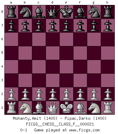 Last move : 0-1 2007 January 23 18:57:52 [Event "FICGS__CHESS__CLASS_F__000021"] [Site "FICGS"] [Date "2006.12.14"] [Round "1"] [White "Mohanty,Amit"] [Black "Pipac,Darko"] [Result "0-1"] [WhiteElo "1400"] [BlackElo "1400"] 0-1 This chess game has been lost on time (started : 2006.12.14 17:52:35) Player Black won this chess game. Follow this game move after move (download)Bobby just drops the pieces and they fall on the right squares. (Miguel Najdorf) Garry Kasparov war erst in der Großmeister-Organisation GMA, dann in der Profischach-Vereinigung PCA, zum Schluss kehrte er wieder in den Schoß der FIDE zurück. Aber gut, manche Leute sind flexibel (Viswanathan Anand) Repentinamente, me resultaba obvio en mi analisis que yo había pasado por alto lo que Fischer había visto en el tablero con la mas grande facilidad. (Mikhail Botvinnik) Je ne suis pas le dernier à jouer lâchement des coups douteux pendant le zeïtnot de l'adversaire pour l'achever: en effet les coups qui font le plus peur sont ceux que l'on ne comprend pas. Je me fais souvent peur quand je joue. (Un professeur anonyme) Chess is as much a mystery as women. (Purdy)