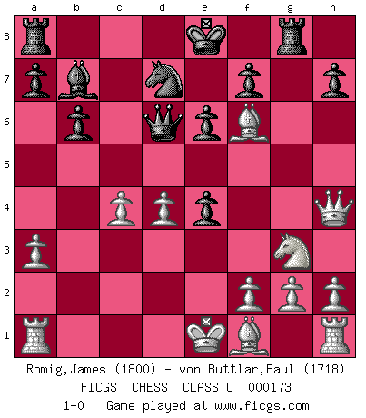 Last move : 1-0 2011 April 5 13:10:41 [Event "FICGS__CHESS__CLASS_C__000173"] [Site "FICGS"] [Date "2011.03.24"] [Round "1"] [White "Romig,James"] [Black "von Buttlar,Paul"] [Result "1-0"] [WhiteElo "1800"] [BlackElo "1718"] 1.e4 e6 2.d4 d5 3.Nc3 Bb4 4.a3 Bxc3+ 5.bxc3 dxe4 6.Qg4 Nf6 7.Qxg7 Rg8 8.Qh6 Nbd7 9.Ne2 c5 10.Ng3 b6 11.Bg5 cxd4 12.cxd4 Bb7 13.Qh4 Qc7 14.c4 Qd6 15.Bxf6 1-0 French : Winawer (Nimzovich) variation Player White won this chess game. Follow this game move after move (download)The most powerful weapon in Chess is to have the next move. (David Bronstein) Warum muß ich gegen diesen IDIOTEN verlieren? (Aaron Nimzowitsch) El Ajedrez moderno está demasiado preocupado con cosas como la estructura de Peones. Olvidenlo, el Jaque Mate termina la partida. (Nigel Short) Vous m'avez demandé de vous exposer quel est le fondement de la prière. Je ne fais que préparer les pièces du jeu sur la table... Nous sera-t-il permis d'en adopter les règles et si nous les appliquons scrupuleusement nous ne tarderons pas à faire mat le Roi divin ! Il ne pourra échapper à nos mains. (Sainte Thérèse d'Avila, Chemin de perfection) Statistics can be made to prove anything - even the truth. (Author unknown)