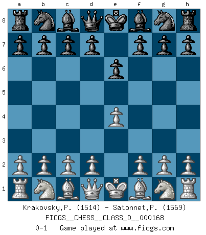 Last move : 0-1 2011 May 6 5:38:10 [Event "FICGS__CHESS__CLASS_D__000168"] [Site "FICGS"] [Date "2011.03.24"] [Round "1"] [White "Krakovsky,Peter"] [Black "Satonnet,Patrick"] [Result "0-1"] [WhiteElo "1514"] [BlackElo "1569"] 1.e4 e6 0-1 This chess game has been lost on time (started : 2011.03.24 20:37:50) French defense Player Black won this chess game. Follow this game move after move (download)Chess is the art which expresses the science of logic. (Mikhail Botvinnik) Wenn ich Weiß habe gewinne ich weil ich Weiß habe, wenn ich Schwarz habe gewinne ich weil ich Bogoljubov bin. (Efim Bogoljubov) Si el ingenio solamente fuese necesario para lucirse, las mujeres serían las mejores jugadoras de Ajedrez del mundo. (Albin) On entre au jeu d'Echecs comme on entre en Religion. Pour le joueur d'Echecs, la partie d'Echecs c'est l'office, la messe, le défilé du 1er Mai, le dépôt de gerbe au Monument aux Morts. C'est un drame sacré. (Michel Roos) Internal peace cannot coexist with external war. (Don Groves)