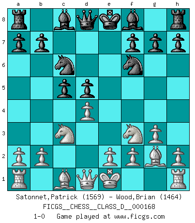 Last move : 1-0 2011 June 5 19:13:2 [Event "FICGS__CHESS__CLASS_D__000168"] [Site "FICGS"] [Date "2011.03.24"] [Round "1"] [White "Satonnet,Patrick"] [Black "Wood,Brian"] [Result "1-0"] [WhiteElo "1569"] [BlackElo "1464"] 1.c4 c5 2.Nc3 Nf6 3.Nf3 e6 4.g3 d5 5.cxd5 exd5 6.d4 Nc6 7.Bg2 1-0 This chess game has been lost on time (started : 2011.03.24 20:37:50) English : Symmetrical variation Player White won this chess game. Follow this game move after move (download)Good positions don't win games, good moves do. (Gerald Abrahams) Wie ich sie so einen nach dem anderen nieder mähte wurde meine Überlegenheit offensichtlich. (José Raúl Capablanca) Me dio la sensación de como si yo estuviera jugando en contra del mismo Ajedrez. - al estar jugando en contra de Robert Fischer (Walter Shipman) Toute estimation doit être constamment réévaluée. (Jacob Estrin) Somehow our devils are never quite what we expect when we meet them face to face. (Nelson DeMille)