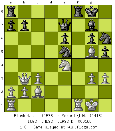 Last move : 1-0 2011 August 30 10:8:13 [Event "FICGS__CHESS__CLASS_D__000168"] [Site "FICGS"] [Date "2011.03.24"] [Round "1"] [White "Plunkett,Louis"] [Black "Makosiej,Wladyslaw"] [Result "1-0"] [WhiteElo "1598"] [BlackElo "1413"] 1.d4 Nf6 2.e3 g6 3.Nd2 Bg7 4.f4 O-O 5.Bd3 d6 6.Ngf3 c5 7.c3 Nc6 8.O-O e5 9.fxe5 dxe5 10.Bb1 cxd4 11.exd4 exd4 12.Qb3 Ng4 13.Ne4 d3 14.Nfg5 Qc7 15.g3 Nce5 16.Bf4 Be6 17.Nxe6 fxe6 18.Bxd3 Qe7 19.Bc2 h5 20.h3 Nh6 21.Bg5 1-0 This chess game has been lost on time (started : 2011.03.24 20:37:50) Queen's pawn game Kingside Castling by player Black (move 4) Kingside Castling by player White (move 8) Player White won this chess game. Follow this game move after move (download)The boy (then a 12 year old boy named Anatoly Karpov) doesn't have a clue about Chess, and there's no future at all for him in this profession. (Mikhail Botvinnik) Bis jetzt ist Weiß einer wohlbekannten Analyse gefolgt. Aber jetzt begeht er einen schrecklichen Fehler: Er beginnt seinen eigenen Kopf zu benutzen. (Siegbert Tarrasch) Prefiero perder una partida realmente buena, que ganar una mala. (David Levy) Vous savez, camarade Pachman, je n'éprouve pas de plaisir à être ministre, je jouerais plutôt aux échecs comme vous, ou alors ferais une révolution au Venezuela. (Che Guevara à Ludek Pachman, 'Checkmate in Prague', 1975) I teach you to lie, cheat and steal, and as soon as my back's turned you wait in line ? (Gregory House, House M.D.)