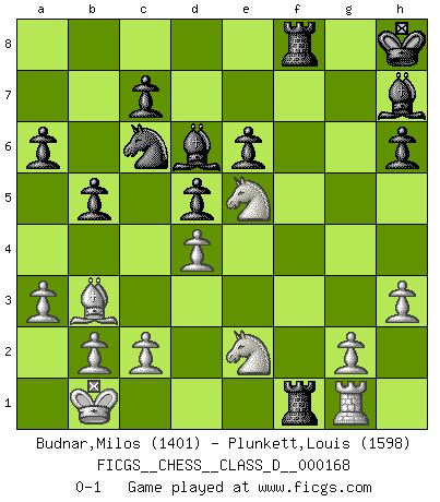 Last move : 0-1 2011 October 5 18:32:18 [Event "FICGS__CHESS__CLASS_D__000168"] [Site "FICGS"] [Date "2011.03.24"] [Round "1"] [White "Budnar,Milos"] [Black "Plunkett,Louis"] [Result "0-1"] [WhiteElo "1401"] [BlackElo "1598"] 1.e4 Nc6 2.d4 d5 3.e5 f6 4.f4 Nh6 5.Bb5 a6 6.Ba4 b5 7.Bb3 Bf5 8.h3 e6 9.a3 Be7 10.Nf3 fxe5 11.fxe5 O-O 12.Bxh6 gxh6 13.Nc3 Bh4+ 14.Ke2 Bg3 15.Qd2 Qe7 16.Qxh6 Kh8 17.Raf1 Rg8 18.Qf6+ Qxf6 19.exf6 Raf8 20.Kd1 Rxf6 21.Kc1 h6 22.Kb1 Na5 23.Nd2 Nc6 24.Nf3 Rgf8 25.Ne2 Bd6 26.Rhg1 Bh7 27.Ne5 Rxf1+ 0-1 KP : Nimzovich defense Kingside Castling by player Black (move 11) Player Black won this chess game. Follow this game move after move (download)To avoid losing a piece, many a person has lost the game. (Savielly Tartakover) Später, ... hatte ich zunehmend Erfolg in entscheidenden Partien. Vielleicht weil ich eine einfache Wahrheit erkannte: nicht nur ich hatte Angst, auch mein Gegner. (Mikhail Nekhemyevich Tal) Tu puedes aprender mucho mas de una partida que pierdas que de una partida ganada. Tendras que perder cientos de partidas antes de llegar a ser un buen jugador. (Jose Raul Capablanca) Horreur, mais aussi harmonie suprême : qu'y avait-il en effet au monde en dehors des échecs ? Le brouillard, l'inconnu, le non-être... (Vladimir Nabokov) The various flowers seem good to different people. (Chinese proverb)