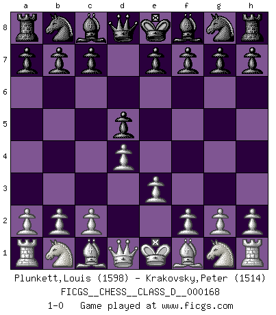 Last move : 1-0 2011 May 6 17:37:13 [Event "FICGS__CHESS__CLASS_D__000168"] [Site "FICGS"] [Date "2011.03.24"] [Round "1"] [White "Plunkett,Louis"] [Black "Krakovsky,Peter"] [Result "1-0"] [WhiteElo "1598"] [BlackElo "1514"] 1.d4 d5 2.e3 1-0 This chess game has been lost on time (started : 2011.03.24 20:37:50) Queen's pawn game Player White won this chess game. Follow this game move after move (download)You are for me the Queen on d8 and I am the Pawn on d7 !! (Eduard Gufeld) Schach ist die gewalttätigste aller Sportarten. (Garry Kasparov) Si el Ajedrez es una ciencia, es la mas inexacta. Si el Ajedrez es un arte, es demasiado inexacto para ser visto como tal. Si el Ajedrez es un deporte, es demasiado esotérico. Si el Ajedrez es un juego, es demasiado exigente para ser solo un juego. Si el Ajedrez es una aventura, es una muy demandante. Si el Ajedrez es una pasión, es una muy gratificante. Si el Ajedrez es la vida, es una muy triste. (Anónimo) La victoire dans une partie d'Echecs appartient la plupart du temps à celui qui voit un peu plus loin que l'adversaire. (Lasker) A good book on your shelf is a friend that turns its back on you and remains a friend. (Author unknown)