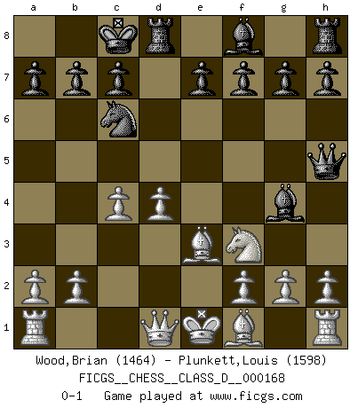 Last move : 0-1 2011 May 29 6:59:5 [Event "FICGS__CHESS__CLASS_D__000168"] [Site "FICGS"] [Date "2011.03.24"] [Round "1"] [White "Wood,Brian"] [Black "Plunkett,Louis"] [Result "0-1"] [WhiteElo "1464"] [BlackElo "1598"] 1.e4 Nc6 2.Nf3 Nf6 3.Nc3 d5 4.exd5 Nxd5 5.Nxd5 Qxd5 6.d4 Bg4 7.Be3 O-O-O 8.c4 Qh5 0-1 This chess game has been lost on time (started : 2011.03.24 20:37:50) KP : Nimzovich defense Queenside Castling by player Black (move 7) Player Black won this chess game. Follow this game move after move (download)Chess mastery essentially consists of analyzing Chess positions accurately. (Mikhail Botvinnik) Ich erzeugte keinen Neid, da mich die Schachspieler als Musiker und die Musiker als Schachspieler betrachteten. (Mark Taimanov) Yo siempre he tenido un ligero sentimiento de lástima por una persona que no tiene conocimiento del Ajedrez. (Siegbert Tarrasch) J'apprécie les joueurs d'est-indienne, c'est grâce à eux que je nourris ma famille depuis tant d'années. (Petrosian) Control your own destiny or someone else will. (Jack Welch)
