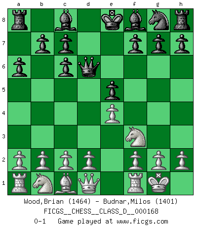 Last move : 0-1 2011 May 29 19:0:17 [Event "FICGS__CHESS__CLASS_D__000168"] [Site "FICGS"] [Date "2011.03.24"] [Round "1"] [White "Wood,Brian"] [Black "Budnar,Milos"] [Result "0-1"] [WhiteElo "1464"] [BlackElo "1401"] 1.e4 e5 2.Nf3 Nc6 3.Bb5 a6 4.Bxc6 dxc6 5.O-O Qd6 0-1 This chess game has been lost on time (started : 2011.03.24 20:37:50) Ruy Lopez : Exchange, Bronstein variation Kingside Castling by player White (move 5) Player Black won this chess game. Follow this game move after move (download)The Chess pieces are the block alphabet which shapes thoughts; and these thoughts, although making a visual design on the chessboard, express their beauty abstractly, like a poem. (Marcel Duchamp) Er war ein guter Schachspieler, aber ich kann Leute nicht ausstehen, die 'Heil Hitler' rufen (Über Alexander Aljechin). (Miguel Najdorf) El Ajedrez es 99 por ciento táctica. (Teichmann) Toutes les manuvres exécutées sur une colonne ouverte ont pour but ultime l'intrusion définitive sur la septième ou la huitième rangée, en plein cur de la position ennemie. (Aaron Nimzovitch) When the going gets tactical, the computers get going. (Hyatt)