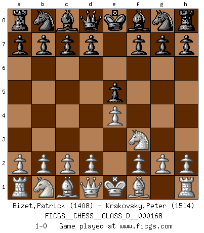 Last move : 1-0 2011 May 6 5:38:10 [Event "FICGS__CHESS__CLASS_D__000168"] [Site "FICGS"] [Date "2011.03.24"] [Round "1"] [White "Bizet,Patrick"] [Black "Krakovsky,Peter"] [Result "1-0"] [WhiteElo "1408"] [BlackElo "1514"] 1.e4 e5 2.Nf3 1-0 This chess game has been lost on time (started : 2011.03.24 20:37:50) King's knight Opening Player White won this chess game. Follow this game move after move (download)In Chess, just as in life, today's bliss may be tomorrow's poison. (Assaic) Der Bart als Geschlechtszeichen mitten im Gesicht ist obszön. Daher gefällt er den Weibern. [Zugegeben, kein Schachzitat, aber unglaublich originell] (Arthur Schopenhauer) Con el tiempo, empecé a progresar en partidas decisivas. Tal vez porque me di cuenta de una simple verdad: no solo estaba yo nervioso sino también mi oponente. (Mikhail Tal) Lorsque vous vous retrouvez devant une position atroce, ne tendez pas un ultime piège dérisoire avec l'intention d'abandonner si l'adversaire le déjoue ! Faites-vous plutôt un devoir de résister comme si votre vie en dépendait. Jouez le coup qui vous déplairait au centuple si vous étiez dans la peau de votre tortionnaire ! Luck is what you have left over after you give 100 percent. (Langston Coleman)