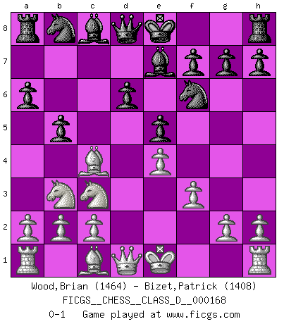 Last move : 0-1 2011 May 16 6:13:34 [Event "FICGS__CHESS__CLASS_D__000168"] [Site "FICGS"] [Date "2011.03.24"] [Round "1"] [White "Wood,Brian"] [Black "Bizet,Patrick"] [Result "0-1"] [WhiteElo "1464"] [BlackElo "1408"] 1.e4 c5 2.Nf3 d6 3.d4 cxd4 4.Nxd4 Nf6 5.Nc3 a6 6.f3 e5 7.Nb3 Be7 8.Bc4 b5 0-1 This chess game has been lost on time (started : 2011.03.24 20:37:50) Sicilian : Najdorf Player Black won this chess game. Follow this game move after move (download)The game of Chess is not merely an idle amusement; several very valuable qualities of the mind are to be acquired and strengthened by it, so as to become habits ready on all occasions; for life is a kind of Chess. (Benjamin Franklin) Dass jemand wie Surab Asmaiparaschwili, der selbst Elopunkte gekauft hat , Vize-Präsident der Fide werden konnte, sagt schon einges über den Zustand dieser Organisation aus. (Joel Lautier) Uno no tiene que jugar muy bien, es suficiente jugar mejor que el oponente. (Siegbert Tarrasch) Psychologiquement, tu dois avoir confiance en toi même, mais cette confiance doit être basée sur des faits. (Robert Fischer) You have to believe in yourself. (Sun Tzu)