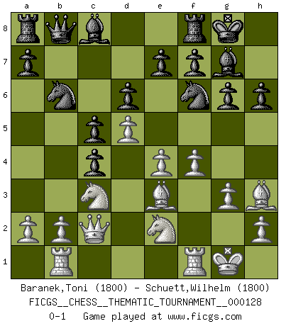 Last move : 0-1 2011 June 17 7:51:8 [Event "FICGS__CHESS__THEMATIC_TOURNAMENT__000128"] [Site "FICGS"] [Date "2011.03.26"] [Round "1"] [White "Baranek,Toni"] [Black "Schuett,Wilhelm"] [Result "0-1"] [WhiteElo "1800"] [BlackElo "1800"] 1.d4 Nf6 2.c4 c5 3.d5 b5 4.g3 bxc4 5.Bg2 Ba6 6.Nc3 g6 7.e4 d6 8.Nge2 Bg7 9.O-O O-O 10.Bg5 h6 11.Be3 Nbd7 12.Qa4 Qc8 13.Bh3 Qb7 14.Rab1 Nb6 15.Qc2 Qb8 16.f4 Bc8 0-1 Benko gambit Kingside Castling by player White (move 9) Kingside Castling by player Black (move 9) Player Black won this chess game. Follow this game move after move (download)Of Chess it has been said that life is not long enough for it, but that is the fault of life, not Chess. (William Ewart Napier) Ich verachte die Medien. (Robert James Fischer) El jugador de combinación piensa hacia adelante; comienza de la posición dada y trabaja las movidas contundentes en su mente. (Emanuel Lasker) Votre prénom est 'Tactique', votre deuxième prénom est 'Tactique' et votre nom est 'Tactique'. (Ken Smith) You know what they say : You lie down with the Devil, you wake up in Hell. (Horatio Caine, C.S.I. Miami)