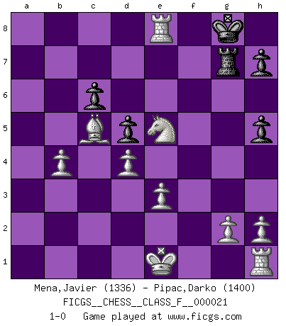 Last move : 1-0 2007 April 10 7:48:39 [Event "FICGS__CHESS__CLASS_F__000021"] [Site "FICGS"] [Date "2006.12.14"] [Round "1"] [White "Mena,Javier"] [Black "Pipac,Darko"] [Result "1-0"] [WhiteElo "1336"] [BlackElo "1400"] 1.d4 d5 2.c4 e6 3.Nc3 Bb4 4.Qa4+ Nc6 5.a3 Bxc3+ 6.bxc3 Bd7 7.cxd5 exd5 8.Qb3 Be6 9.Qxb7 Na5 10.Qb4 c6 11.Bf4 Nf6 12.e3 Nh5 13.Be5 f6 14.Bd6 Rb8 15.Bxb8 Qb6 16.Be2 Nb3 17.Rb1 Qxb4 18.axb4 Nxd4 19.cxd4 O-O 20.Bxa7 g6 21.Bxh5 gxh5 22.Ra1 f5 23.Bc5 Rf7 24.Ra6 f4 25.Nf3 fxe3 26.fxe3 Bd7 27.Ne5 Rg7 28.Ra8+ Be8 29.Rxe8+ 1-0 QGD : 3.Nc3 Kingside Castling by player Black (move 19) Player White won this chess game. Follow this game move after move (download)Chess is a part of culture and if a culture is declining then Chess too will decline. (Mikhail Botvinnik) Es gibt Leute, die glauben, alles wäre vernünftig, was man mit einem ernsthaften Gesicht tut. (Georg Christoph Lichtenberg) El pensamiento metódico es mas útil en el Ajedrez que la inspiración. (C. J. S. Purdy) Tous ces prétendus hommes politiques sont les pions, les Cavaliers, les Tours ou les Fous d'une partie d'échecs qui se jouera tant qu'un hasard ne renversera pas l'échiquier. (Honoré de Balzac) Two beer, or not two beer. (Unknown)