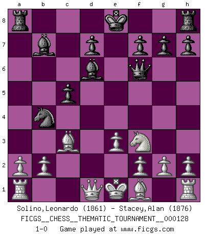 Last move : 1-0 2011 July 14 20:22:16 [Event "FICGS__CHESS__THEMATIC_TOURNAMENT__000128"] [Site "FICGS"] [Date "2011.03.26"] [Round "1"] [White "Solino,Leonardo"] [Black "Stacey,Alan"] [Result "1-0"] [WhiteElo "1861"] [BlackElo "1876"] 1.d4 Nf6 2.c4 c5 3.d5 b5 4.cxb5 a6 5.e3 e6 6.Nc3 exd5 7.Nxd5 Bb7 8.Nxf6+ Qxf6 9.Nf3 Bd6 10.bxa6 Nxa6 11.Bd2 Nb4 12.Bc3 1-0 Benko gambit half accepted Player White won this chess game. Follow this game move after move (download)Chess teaches you to control the initial excitement you feel when you see something that looks good and it trains you to think objectively when you're in trouble. (Stanley Kubrick) Weshalb minderdergeübte Spieler mit g2-g4 beginnen? Die betreffenden sind unschlüssig, ob sie nun rechts (h4) oder links (f4) beginnen sollen, und in ihrer Ratlosigkeit entschliessen sie sich nach guter Bürgerart dazu, den goldenen Mittelweg zu wählen. (Aaron Nimzowitsch) El Ajedrez es sobre todo, ¡una pelea!. (Emanuel Lasker) On est toujours la mazette de quelqu'un d'autre. (Anonyme) It's not a bug - it's an undocumented feature. (Anonymous)