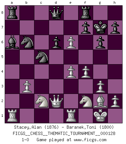 Last move : 1-0 2011 June 15 7:46:43 [Event "FICGS__CHESS__THEMATIC_TOURNAMENT__000128"] [Site "FICGS"] [Date "2011.03.26"] [Round "1"] [White "Stacey,Alan"] [Black "Baranek,Toni"] [Result "1-0"] [WhiteElo "1876"] [BlackElo "1800"] 1.d4 Nf6 2.c4 c5 3.d5 b5 4.cxb5 a6 5.bxa6 Bxa6 6.g3 g6 7.b3 Bg7 8.Bb2 O-O 9.Bg2 d6 10.Nh3 Nbd7 11.O-O Nb6 12.Re1 Rc8 13.e4 c4 14.f4 cxb3 15.axb3 Ra8 16.Nf2 Bb5 17.Na3 Ba6 18.Bd4 Nfd7 19.Bxg7 Kxg7 20.Qd2 Nc5 21.Nc2 e5 22.dxe6 1-0 Benko gambit accepted Kingside Castling by player Black (move 8) Kingside Castling by player White (move 11) Player White won this chess game. Follow this game move after move (download)Many Chess players were surprised when after the game, Fischer quietly explained: 'I had already analyzed this possibility' in a position which I thought was not possible to foresee from the opening. (Mikhail Tal) Die unerbitterlichsten Regeln im Schach sind die Ausnahmen. (Savielly Grigorievitsch Tartakower) Preferería tener un Peón que un dedo. (Reuben Fine) Les pièces de l'échiquier étaient impitoyables. Elles le retenaient, elles l'absorbaient. Il y avait de l'horreur en cela, mais aussi une harmonie unique. Car, qu'y a-t-il dans le monde, à part les échecs ? (V. Nabokov) The weakness of an artist is dogma. (Josh Waitzkin)