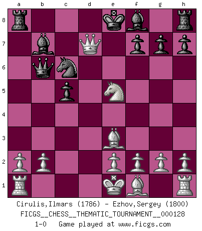 Last move : 1-0 2011 May 7 12:56:48 [Event "FICGS__CHESS__THEMATIC_TOURNAMENT__000128"] [Site "FICGS"] [Date "2011.03.26"] [Round "1"] [White "Cirulis,Ilmars"] [Black "Ezhov,Sergey"] [Result "1-0"] [WhiteElo "1786"] [BlackElo "1800"] 1.d4 Nf6 2.c4 c5 3.d5 b5 4.cxb5 a6 5.bxa6 Bxa6 6.Nc3 e6 7.Nf3 exd5 8.Nxd5 Nxd5 9.Qxd5 Nc6 10.Be3 Qb6 11.Ne5 Bb7 12.Qxd7+ 1-0 Benko gambit accepted Player White won this chess game. Follow this game move after move (download)We must make sure that Chess will not be like a dead language, very interesting, but for a very small group. (Sytze Faber) Kostenjuk hat keinen Sexappeal. (Loek van Wely) Bobby Fischer es el jugador de Ajedrez mas grande que jamás haya existido. (Ken Smith) La conception d'un plan est le processus par lequel un joueur exploite les avantages de sa position tout en s'efforçant d'en réduire au minimum les inconvénients. Afin de garantir le succès, un plan doit toujours se fonder sur un diagnostic objectif des particularités d'une position. La conception d'un plan est d'autant plus difficile que la position est équilibrée, et grandement facilitée lorsqu'il n'existe qu'un seul plan susceptible de répondre aux exigences de la position. (Harry Golombek) In God we trust, all others we virus scan. (Anonymous)