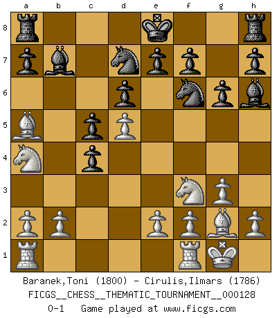 Last move : 0-1 2011 June 16 7:50:28 [Event "FICGS__CHESS__THEMATIC_TOURNAMENT__000128"] [Site "FICGS"] [Date "2011.03.26"] [Round "1"] [White "Baranek,Toni"] [Black "Cirulis,Ilmars"] [Result "0-1"] [WhiteElo "1800"] [BlackElo "1786"] 1.d4 Nf6 2.c4 c5 3.d5 b5 4.g3 bxc4 5.Bg2 d6 6.Nf3 Qa5+ 7.Bd2 Qa6 8.Nc3 Nbd7 9.O-O g6 10.Qa4 Qxa4 11.Nxa4 Bb7 12.Ba5 Bh6 0-1 Benko gambit Kingside Castling by player White (move 9) Player Black won this chess game. Follow this game move after move (download)Best by test: 1. e4 (Bobby Fischer) Fischer machte Schach einfach zu einer aufregenden Sache, wann immer er sich ans Brett setzte. (Raymond Keene) Vive, pierde y aprende al observar a tu oponente como gana. (Amber Steenbock) RxDa4 pat (...) Without enthusiasm, virtue functions not at all, and vice only poorly. (Mignon McLaughlin, The Neurotic's Notebook, 1960)
