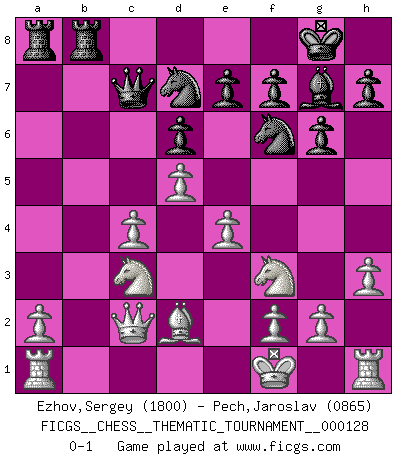 Last move : 0-1 2011 September 20 22:34:28 [Event "FICGS__CHESS__THEMATIC_TOURNAMENT__000128"] [Site "FICGS"] [Date "2011.03.26"] [Round "1"] [White "Ezhov,Sergey"] [Black "Pech,Jaroslav"] [Result "0-1"] [WhiteElo "1800"] [BlackElo "0865"] 1.d4 Nf6 2.c4 c5 3.d5 b5 4.cxb5 a6 5.bxa6 Bxa6 6.Nc3 g6 7.Nf3 d6 8.e3 Bxf1 9.Kxf1 Nbd7 10.Bd2 Bg7 11.h3 O-O 12.e4 Qb6 13.Qc2 Rfb8 14.b3 c4 15.bxc4 Qc7 0-1 This chess game has been lost on time (started : 2011.03.26 8:5:28) Benko gambit accepted Kingside Castling by player Black (move 11) Player Black won this chess game. Follow this game move after move (download)Chess is the art of analysis. (Mikhail Botvinnik) Frage des Reporters: -Worin besteht das Ziel von Gambiteröffnungen? Antwort: -Auf Kosten der Partie einen Ruf als Angriffspieler zu erwerben.- (Siegbert Tarrasch) Cuando tengo las piezas blancas, yo gano porque soy blanco; Cuando tengo las piezas negras, yo gano porque soy Bogolyubov. (Bogolyubov) Karpov est une pièce de musée. (Garry Kasparov) Life is like internet, nothing interesting, but noone want to leave it. (Ilmars Cirulis)