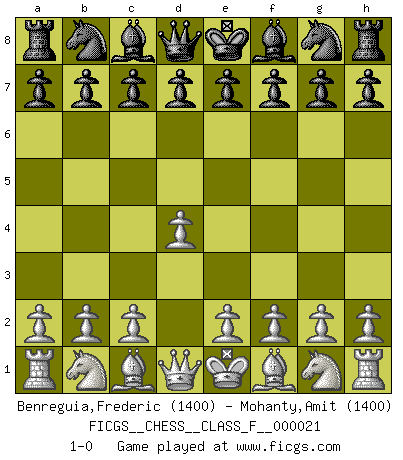 Last move : 1-0 2007 January 23 18:57:52 [Event "FICGS__CHESS__CLASS_F__000021"] [Site "FICGS"] [Date "2006.12.14"] [Round "1"] [White "Benreguia,Frederic"] [Black "Mohanty,Amit"] [Result "1-0"] [WhiteElo "1400"] [BlackElo "1400"] 1.d4 1-0 This chess game has been lost on time (started : 2006.12.14 17:52:35) Queen's pawn Player White won this chess game. Follow this game move after move (download)When you see a good move, look for a better one. (Emanuel Lasker) Man wirke der falschen Auffassung entgegen, als ob jeder Zug Unmittelbares zu leisten habe; auch Werte- und Ruhezüge haben ihre Existenzberechtigung. (Aaron Nimzowitsch) Yo he agregado estos principios a la ley: pongan los Caballos en acción antes de que los dos Alfiles sean desarrollados. (Emanuel Lasker) Roi des jeux et jeu des rois, les échecs portent en eux un sentiment d'infini. Ils donnent à celui qui s'est efforcé d'en approfondir les arcanes l'impression de n'être pas à la mesure de l'homme; en fait, ils constituent un résumé de l'univers, un microcosme, et figurent cette grande échelle qui, dans les plans de la lumière descend jusqu'à la matière, qui des abîmes insondables remonte jusqu'en l'infini de Dieu. (Pyrame) Unless I accept my faults I will most certainly doubt my virtues. (Hugh Prather)