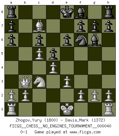 Last move : 0-1 2011 June 21 8:2:17 [Event "FICGS__CHESS__NO_ENGINES_TOURNAMENT__000040"] [Site "FICGS"] [Date "2011.03.26"] [Round "1"] [White "Zhogov,Yury"] [Black "Davis,Mark"] [Result "0-1"] [WhiteElo "1800"] [BlackElo "1372"] 1.d4 d5 2.c4 c6 3.Nc3 Nf6 4.Nf3 Bg4 5.Ne5 Bh5 6.Qb3 Qc7 7.Bf4 Qb6 8.e3 e6 9.c5 Qc7 10.Ng6 Bxg6 11.Bxc7 Na6 12.Bxa6 bxa6 0-1 QGD Slav defense Player Black won this chess game. Follow this game move after move (download)Chess books should be used as we use glasses: to assist the sight, although some players make use of them as if they thought they conferred sight. (Jose Raul Capablanca) Wenn sie aufgeben, dann danke ich Ihnen für das Spiel (Eventualzug beim Fernschach). (Anonymous) ¿Porque tengo que perder ante este idiota?. (Aron Nimzovich) Je fais ceci parce que dans cinquante coups j'obtiendrai cela; je m'appelle Mikhail Moisevitch Botvinnik. (Botvinnik) Whatever you do, don't be bored. This is absolutely the most exciting time we could have possibly hoped to be alive. And things are just starting. (From movie Waking life)