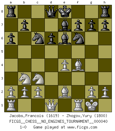 Last move : 1-0 2011 June 21 20:1:46 [Event "FICGS__CHESS__NO_ENGINES_TOURNAMENT__000040"] [Site "FICGS"] [Date "2011.03.26"] [Round "1"] [White "Jacobs,Francois"] [Black "Zhogov,Yury"] [Result "1-0"] [WhiteElo "1619"] [BlackElo "1800"] 1.e4 c5 2.Nf3 d6 3.d4 cxd4 4.Nxd4 Nf6 5.Nc3 a6 6.Be2 e5 7.Nb3 Be6 8.O-O Nc6 9.Be3 Be7 10.f4 exf4 11.Bxf4 1-0 Sicilian : Najdorf, Opovcensky variation Kingside Castling by player White (move 8) Player White won this chess game. Follow this game move after move (download)The laws of Chess do not permit a free choice: you have to move whether you like it or not. (Emanuel Lasker) Taktik ist was man tun muß, wenn etwas zu tun ist. Strategie ist was man tun muß, wenn nichts zu tun ist. (Savielly Grigorievitsch Tartakower) Yo he agregado estos principios a la ley: pongan los Caballos en acción antes de que los dos Alfiles sean desarrollados. (Emanuel Lasker) Soyez une menace à chaque fois que vous vous asseyez pour jouer. (Ken Smith) It is not enough to be a good player... you must also play well. (Siegbert Tarrasch)