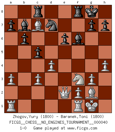 Last move : 1-0 2011 June 14 7:45:17 [Event "FICGS__CHESS__NO_ENGINES_TOURNAMENT__000040"] [Site "FICGS"] [Date "2011.03.26"] [Round "1"] [White "Zhogov,Yury"] [Black "Baranek,Toni"] [Result "1-0"] [WhiteElo "1800"] [BlackElo "1800"] 1.d4 Nf6 2.c4 e6 3.a3 b6 4.Nc3 Bb7 5.Nf3 d5 6.cxd5 Nxd5 7.g3 Be7 8.Bg2 O-O 9.Qc2 Nd7 10.e4 Nxc3 11.bxc3 c5 12.O-O Rc8 13.Qe2 Qc7 14.Bf4 Bd6 15.e5 Be7 16.h4 f6 17.exf6 Bxf6 18.Bxc7 1-0 Queen's pawn game Kingside Castling by player Black (move 8) Kingside Castling by player White (move 12) Player White won this chess game. Follow this game move after move (download)The hardest game to win is a won game. (Emanuel Lasker) Mein Gehirn das ist mein zweitwichtigstes Organ [Aus dem Film: Der Schläfer]. (Woody Allen) No nos podemos resistir a la fascinación de un sacrificio ya que la pasión por los sacrificios es parte de la naturaleza de un jugador de Ajedrez. (Rudolf Spielman) Aux échecs, l'amour-propre est satisfait quand on remporte la victoire, mais il n'y a pas de honte à être battu. (Benjamin Franklin) A woman without a man is like a fish without a bicycle. (Gloria Steinem)