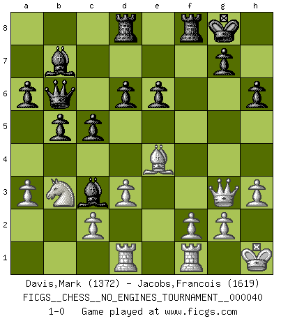 Last move : 1-0 2011 August 13 15:1:4 [Event "FICGS__CHESS__NO_ENGINES_TOURNAMENT__000040"] [Site "FICGS"] [Date "2011.03.26"] [Round "1"] [White "Davis,Mark"] [Black "Jacobs,Francois"] [Result "1-0"] [WhiteElo "1372"] [BlackElo "1619"] 1.e4 c5 2.Nf3 e6 3.Bb5 a6 4.Be2 Nc6 5.O-O d6 6.Nc3 Nf6 7.d3 Be7 8.Bf4 O-O 9.Rc1 Bd7 10.a3 Rc8 11.Bg5 b5 12.Qd2 Qc7 13.Bh4 h6 14.Rfe1 Rfe8 15.Rcd1 Rcd8 16.Bg3 Bc8 17.Qc1 Qb6 18.h3 Bf8 19.Bh4 Be7 20.Qf4 Nh5 21.Qh2 Nf6 22.Bg3 Bb7 23.Nd2 Nd4 24.Rc1 Nh5 25.Bd1 Nxg3 26.Qxg3 Bf6 27.Ne2 Nxe2+ 28.Bxe2 Bxb2 29.Rcd1 Bf6 30.Nb3 Bc3 31.Rf1 Rf8 32.Kh1 f5 33.Bf3 fxe4 34.Bxe4 1-0 Sicilian defense Kingside Castling by player White (move 5) Kingside Castling by player Black (move 8) Player White won this chess game. Follow this game move after move (download)Those who say they understand Chess, understand nothing. (Robert Hubner) Ich bin stolz ein Bulgare zu sein. (Veselin Topalov) Uno no tiene que jugar muy bien, es suficiente jugar mejor que el oponente. (Siegbert Tarrasch) On est toujours la mazette de quelqu'un d'autre. (Anonyme) There are two kinds of people in the world, my friend. Those who have a loaded gun and those who dig. You dig ! (Blondie in The Good, The Bad and The Ugly)