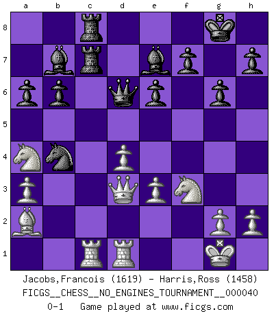 Last move : 0-1 2011 April 28 18:5:41 [Event "FICGS__CHESS__NO_ENGINES_TOURNAMENT__000040"] [Site "FICGS"] [Date "2011.03.26"] [Round "1"] [White "Jacobs,Francois"] [Black "Harris,Ross"] [Result "0-1"] [WhiteElo "1619"] [BlackElo "1458"] 1.e4 c6 2.c4 d5 3.cxd5 cxd5 4.exd5 Qxd5 5.Nc3 Qd6 6.d4 Nc6 7.Nf3 e6 8.Be3 Nf6 9.a3 Be7 10.Bd3 O-O 11.O-O b6 12.Rc1 Bb7 13.b4 Rfd8 14.Bb1 Rac8 15.Qd3 g6 16.Rfd1 Ng4 17.Qe4 Nxe3 18.fxe3 a6 19.Ba2 Rc7 20.Qd3 Rdc8 21.Na4 Nxb4 0-1 Caro-Kann : Anti-anti-Caro-Kann defense Kingside Castling by player Black (move 10) Kingside Castling by player White (move 11) Player Black won this chess game. Follow this game move after move (download)Many have become Chess Masters, no one has become the Master of Chess. (Siegbert Tarrasch) Ohne Leiden bildet sich kein Charakter. (Ernst Freiherr von Feuchtersleben) Aquel que toma al Peón de Caballo de la Reina, se pasará la noche a dormir en la calle. (Anónimo) D'abord les bases : Jouez et étudiez, puis étudiez et jouez, ensuite jouez et étudiez, puis étudiez et jouez. Deuxièmement : Donnez toujours le meilleur de vous-même ! (Ken Smith) Home computers are being called upon to perform many new functions, including the consumption of homework formerly eaten by the dog. (Doug Larson)