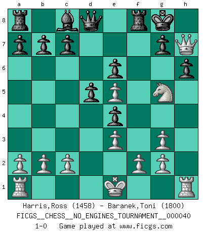 Last move : 1-0 2011 March 30 17:42:29 [Event "FICGS__CHESS__NO_ENGINES_TOURNAMENT__000040"] [Site "FICGS"] [Date "2011.03.26"] [Round "1"] [White "Harris,Ross"] [Black "Baranek,Toni"] [Result "1-0"] [WhiteElo "1458"] [BlackElo "1800"] 1.d4 Nf6 2.Nf3 e6 3.Bf4 d5 4.e3 Bd6 5.Bg3 O-O 6.Nbd2 Bxg3 7.hxg3 Nc6 8.Ne5 Nxe5 9.dxe5 Ne4 10.Qh5 h6 11.Nf3 f6 12.Qg6 Kh8 13.Bd3 f5 14.Bxe4 fxe4 15.Ng5 Kg8 16.Qh7+ 1-0 Queen's pawn game Kingside Castling by player Black (move 5) Player White won this chess game. Follow this game move after move (download)Castle early and often. (Rob Sillars) Ich bewundere Kasparows phantasievolle Angriffssiege aus den Achtzigern und Neunzigern, aber wenn man sie mit dem Computer überprüft, nimmt der Computer in jeder zweiten Partie die Opfer an, verteidigt sich und gewinnt. (Vladimir Kramnik) Ciertamente, de todas la drogas del mundo, el Ajedrez debe ser el mas placentero permamentemente. (Assiac) Les Echecs sont affaire de jugement sensible. Savoir quand frapper et quand esquiver. (Fischer) Panic is a sudden desertion of us, an a going over to the enemy of our imagination. (Christian Nevell Bovee)