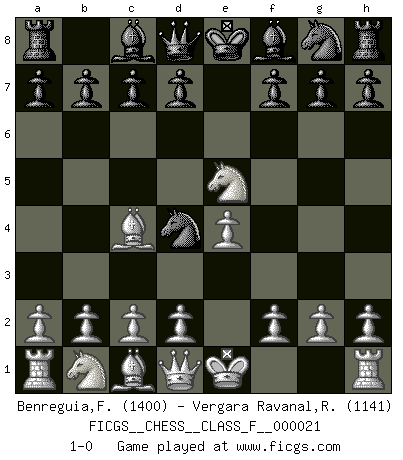 Last move : 1-0 2007 January 28 1:36:23 [Event "FICGS__CHESS__CLASS_F__000021"] [Site "FICGS"] [Date "2006.12.14"] [Round "1"] [White "Benreguia,Frederic"] [Black "Vergara Ravanal,Raul Andres"] [Result "1-0"] [WhiteElo "1400"] [BlackElo "1141"] 1.e4 e5 2.Nf3 Nc6 3.Bc4 Nd4 4.Nxe5 1-0 This chess game has been lost on time (started : 2006.12.14 17:52:35) King's pawn game Player White won this chess game. Follow this game move after move (download)A strong memory, concentration, imagination, and a strong will is required to become a great Chess player. (Bobby Fischer) Den Ruhm habe ich schon, jetzt brauche ich noch das Geld. (Wilhelm Steinitz) Bobby Fischer es el jugador de Ajedrez mas grande que jamás haya existido. (Ken Smith) Votre seul travail dans les ouvertures est d'obtenir un milieu de partie jouable. (Lajos Portish) The real danger is not that computers will begin to think like men, but that men will begin to think like computers. (Sydney J. Harris)