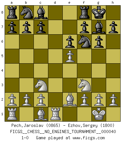 Last move : 1-0 2011 June 27 20:29:49 [Event "FICGS__CHESS__NO_ENGINES_TOURNAMENT__000040"] [Site "FICGS"] [Date "2011.03.26"] [Round "1"] [White "Pech,Jaroslav"] [Black "Ezhov,Sergey"] [Result "1-0"] [WhiteElo "0865"] [BlackElo "1800"] 1.e4 d6 2.d4 Nf6 3.Nc3 g6 4.Nf3 Bg7 5.Be2 O-O 6.O-O e6 7.e5 dxe5 8.dxe5 Qxd1 9.Rxd1 1-0 This chess game has been lost on time (started : 2011.03.26 12:57:12) Pirc : Classical system, 5.Be2 Kingside Castling by player Black (move 5) Kingside Castling by player White (move 6) Player White won this chess game. Follow this game move after move (download)Up to this point White has been following well-known analysis. But now he makes a fatal error: he begins to use his own head. (Siegbert Tarrasch) Wenn Du nicht kämpfst, um anderen etwas zu beweisen, sondern nur für Dich selbst, dann bist du fast unbesiegbar. (Garry Kasparov) Si un gobernante no entiende al Ajedrez, ¿como puede governar él un reinado?. (El Rey Khusros II) Les Cavaliers se révèlent fort utiles dans les positions fermées. D'habitude, les Fous sont un peu plus forts que les Cavaliers dans les positions ouvertes. Qu'on le veuille ou non, il restera toujours des exceptions ! The worth of a book is to be measured by what you can carry away from it. (James Bryce)