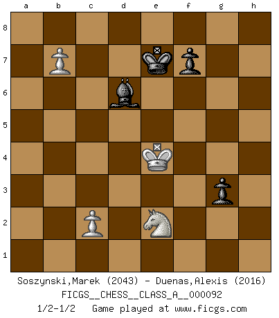 Last move : 1/2-1/2 2011 April 15 1:16:53 [Event "FICGS__CHESS__CLASS_A__000092"] [Site "FICGS"] [Date "2011.03.27"] [Round "1"] [White "Soszynski,Marek"] [Black "Duenas,Alexis"] [Result "1/2-1/2"] [WhiteElo "2043"] [BlackElo "2016"] 1.e4 e5 2.d4 exd4 3.Qxd4 Nc6 4.Qe3 Nf6 5.Bd2 Bb4 6.Nc3 O-O 7.O-O-O Re8 8.Qg3 Rxe4 9.a3 Bd6 10.f4 Re8 11.Bd3 Bf8 12.Nf3 d5 13.Rhe1 Ne7 14.Qf2 Nf5 15.Re5 Ng4 16.Rxe8 Qxe8 17.Qe1 Qxe1 18.Rxe1 Nf6 19.g4 Nxg4 20.Nxd5 Bd7 21.Ne5 Nxe5 22.Rxe5 Nd4 23.Rg5 Bc6 24.Nf6+ Kh8 25.Nxh7 Be7 26.Rg3 Kg8 27.Ng5 Rd8 28.Bc3 b6 29.h4 Bd6 30.Nh3 Bf8 31.Kb1 Be8 32.h5 c5 33.Ng5 Rd6 34.Rg1 a5 35.Bc4 b5 36.Re1 bxc4 37.Rxe8 Rh6 38.Bxd4 cxd4 39.Nf3 Rxh5 40.Nxd4 g6 41.Rc8 Rh1+ 42.Ka2 Rf1 43.Rxc4 Rxf4 44.b4 axb4 45.axb4 g5 46.b5 g4 47.b6 Bd6 48.b7 Kg7 49.Kb3 g3 50.Ne2 Rxc4 51.Kxc4 Kf6 52.Kd5 Ke7 53.Ke4 1/2-1/2 Centre game : Berger variation Kingside Castling by player Black (move 6) Queenside Castling by player White (move 7) 10 pieces endgame at move 45 : White KRNPP , Black KRBPP WHITE : King + 1 Rook 1 Knight 2 Pawns BLACK : King + 1 Rook 1 Bishop 2 Pawns 9 pieces endgame at move 50 : White KNPP , Black KRBPP WHITE : King + 1 Knight 2 Pawns BLACK : King + 1 Rook 1 Bishop 2 Pawns 8 pieces endgame at move 51 : White KNPP , Black KBPP WHITE : King + 1 Knight 2 Pawns BLACK : King + 1 Bishop 2 Pawns This chess game ended in a draw. Follow this game move after move (download)Chess is imagination. (David Bronstein) Über Frauen: Chess is better. (Robert James Fischer) Los problemas de Ajedrez exigen del compositor las mismas virtudes que caracterizan todo el arte de valor: originalidad, invención, concisión, armonía, complejidad e insinceridad explendida. (Vladimir Nabokov) On est toujours la mazette de quelqu'un d'autre. (Anonyme) Is not life a hundred times too short to bore ourselves ? (Friedrich Nietzsche)