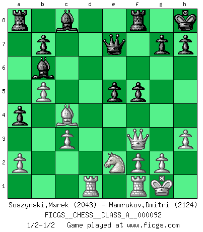 Last move : 1/2-1/2 2011 April 29 9:2:52 [Event "FICGS__CHESS__CLASS_A__000092"] [Site "FICGS"] [Date "2011.03.27"] [Round "1"] [White "Soszynski,Marek"] [Black "Mamrukov,Dmitri"] [Result "1/2-1/2"] [WhiteElo "2043"] [BlackElo "2124"] 1.e4 c6 2.Nc3 d5 3.Qf3 dxe4 4.Nxe4 Nf6 5.Nxf6+ exf6 6.c3 Bd6 7.d4 O-O 8.Bd3 c5 9.dxc5 Bxc5 10.Bf4 Nc6 11.Rd1 Qe7+ 12.Ne2 Ne5 13.Bxe5 fxe5 14.O-O f5 15.Bc4+ Kh8 16.b4 Bb6 17.h3 a5 18.b5 a4 1/2-1/2 Caro-Kann : GOldman (Spielmann) variation Kingside Castling by player Black (move 7) Kingside Castling by player White (move 14) This chess game ended in a draw. Follow this game move after move (download)It was clear to me that the vulnerable point of the American Grandmaster (Bobby Fischer) was in double-edged, hanging, irrational positions, where he often failed to find a win even in a won position. (Efim Geller) Es ist wirklich schade, dass so viele Schachspieler nicht auf ihr Äußeres achten! (Alexandra Kosteniuk) Coloca el contenido del tablero de Ajedrez en un sombrero, agita las piezas vigorosamente, derrámalas en el tablero desde una altura de medio metro y así obtienes el estilo de Wilhelm Steinitz. (H. E. Bird) D'abord les bases : Jouez et étudiez, puis étudiez et jouez, ensuite jouez et étudiez, puis étudiez et jouez. Deuxièmement : Donnez toujours le meilleur de vous-même ! (Ken Smith) When you don't know what to do, walk fast and look worried. (Anonymous)