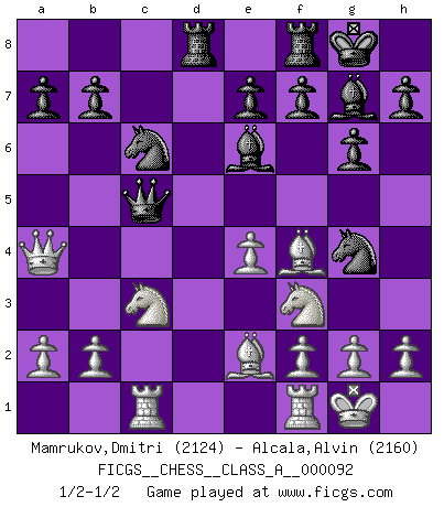 Last move : 1/2-1/2 2011 June 14 23:51:35 [Event "FICGS__CHESS__CLASS_A__000092"] [Site "FICGS"] [Date "2011.03.27"] [Round "1"] [White "Mamrukov,Dmitri"] [Black "Alcala,Alvin"] [Result "1/2-1/2"] [WhiteElo "2124"] [BlackElo "2160"] 1.d4 Nf6 2.c4 c6 3.Nf3 d5 4.Qc2 g6 5.Bf4 Bg7 6.e3 O-O 7.Nc3 c5 8.dxc5 Qa5 9.Rd1 dxc4 10.Bxc4 Nc6 11.e4 Qxc5 12.Be2 Be6 13.O-O Ng4 14.Rc1 Rad8 15.Qa4 1/2-1/2 Queen's pawn game Kingside Castling by player Black (move 6) Kingside Castling by player White (move 13) This chess game ended in a draw. Follow this game move after move (download)A great player and a great example for many. His book My 60 Memorable Games had a big impact on me. It is a shame he didn't continue to enrich the world of chess with his unparalleled understanding after 1972. (Jan Timman, about Bobby Fischer's death) Nach Morphy wurde nichts neues mehr in der Behandlung offener Positionen gefunden. (Mikhail Moiseyevich Botvinik) Me siento como si fuera una pieza en una partida de Ajedrez, cuando mi oponente me indica: esa pieza no puede ser movida. (Soren Kierkegaard) J'ai vu le vaincu d'Echecs jouer des années durant dans l'espoir de la fête de la victoire. Car tu es plus riche de ce qu'elle existe si même elle n'est point pour toi. Ainsi de la perle du fond des mers. (Antoine de Saint-Exupéry) Mandala - that's it! 16x16 squares as multiple of the four and the eight because of the Four Noble Truths and the Noble Eightfold Path. (Heinz-Georg Lehnhoff about Big Chess)