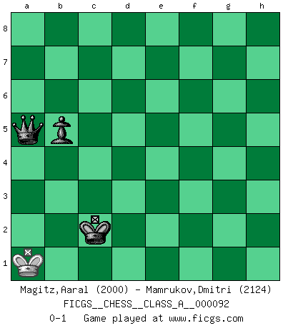 Last move : 0-1 2011 June 17 14:25:42 [Event "FICGS__CHESS__CLASS_A__000092"] [Site "FICGS"] [Date "2011.03.27"] [Round "1"] [White "Magitz,Aaral"] [Black "Mamrukov,Dmitri"] [Result "0-1"] [WhiteElo "2000"] [BlackElo "2124"] 1.e4 c6 2.d4 d5 3.exd5 cxd5 4.c4 Nf6 5.Nc3 Nc6 6.Nf3 Bg4 7.cxd5 Nxd5 8.Bc4 e6 9.O-O Be7 10.h3 Bxf3 11.Qxf3 Nxd4 12.Qe4 Nf6 13.Qxb7 Rb8 14.Qa6 O-O 15.Rd1 e5 16.b3 Qc7 17.Bd2 Rb6 18.Qa5 Bb4 19.Qa4 Bc5 20.Rac1 Rd8 21.a3 Rbd6 22.Be3 Qe7 23.Re1 Bb6 24.Nb5 R6d7 25.b4 g6 26.Nxd4 Bxd4 27.Qb3 Rc7 28.Bxd4 Rxd4 29.Bf1 Rxc1 30.Rxc1 Kg7 31.Rc6 h5 32.Qf3 h4 33.Ra6 Nd5 34.Ra5 Nf4 35.Qc3 Re4 36.Kh2 Rd4 37.Qe3 Nd5 38.Qc1 Nf4 39.Qe1 f6 40.Qc1 Rd7 41.Ra6 Nd5 42.Bb5 Rc7 43.Qd2 Nb6 44.Ra5 e4 45.Be2 Rd7 46.Qc1 Nd5 47.Kg1 e3 48.fxe3 Nxe3 49.Kf2 Nf5 50.Qc5 Ng3 51.Qxe7+ Rxe7 52.Bd3 f5 53.Ra6 Kh6 54.Kf3 Kg5 55.Rc6 Rd7 56.Bb5 Rd2 57.Ra6 Ne4 58.Be2 Nc3 59.Bc4 Rd4 60.Rc6 Nb1 61.Bf7 Rd3+ 62.Kf2 Nc3 63.Rxg6+ Kf4 64.b5 Rd2+ 65.Kg1 Rd1+ 66.Kh2 Ne4 67.Rh6 Ke3 68.Re6 Kf2 69.Rc6 f4 70.Rc4 Ke3 71.Rxe4+ Kxe4 72.Be8 Ke3 73.Bc6 Ra1 74.a4 Ra2 75.b6 axb6 76.Kg1 Ra3 77.Kh2 Ra1 78.Bd7 f3 79.gxf3 Ra2+ 80.Kh1 Kxf3 81.Kg1 Rf2 82.Bf5 Kg3 83.Bg4 Rf7 84.Bh5 Rf4 85.Bg4 Rxa4 86.Kf1 Rxg4 87.hxg4 Kxg4 88.Kf2 h3 89.Kg1 b5 90.Kf2 Kf4 91.Ke2 h2 92.Kd3 h1Q 93.Kc3 Ke3 94.Kb2 Kd2 95.Kb3 Qe4 96.Kb2 Qb4+ 97.Ka2 Kc2 98.Ka1 Qa5+ 0-1 Caro-Kann : Panov-Botvinnik attack Kingside Castling by player White (move 9) Kingside Castling by player Black (move 14) 10 pieces endgame at move 75 : White KBPPP , Black KRPPP WHITE : King + 1 Bishop 3 Pawns BLACK : King + 1 Rook 3 Pawns 9 pieces endgame at move 79 : White KBPPP , Black KRPP WHITE : King + 1 Bishop 3 Pawns BLACK : King + 1 Rook 2 Pawns 8 pieces endgame at move 80 : White KBPP , Black KRPP WHITE : King + 1 Bishop 2 Pawns BLACK : King + 1 Rook 2 Pawns 7 pieces endgame at move 85 : White KBP , Black KRPP WHITE : King + 1 Bishop 1 Pawn BLACK : King + 1 Rook 2 Pawns 6 pieces endgame at move 86 : White KP , Black KRPP WHITE : King + 1 Pawn BLACK : King + 1 Rook 2 Pawns 5 pieces endgame at move 87 : White KP , Black KPP WHITE : King + 1 Pawn BLACK : King + 2 Pawns 4 pieces endgame at move 87 : White K , Black KPP WHITE : King + BLACK : King + 2 Pawns Promotion Queen by player Black (move 92) Player Black won this chess game. Follow this game move after move (download)By the beauty of his games, the clarity of his play, and the brilliance of his ideas, Fischer made himself an artist of the same stature as Brahms, Rembrandt, and Shakespeare. (David Levy) Mein Name ist Rustam Kamsky. Sie haben meinen Sohn belästigt. Bereiten Sie sich aufs Sterben vor. (Rustam Kamsky) El Ajedrez hace al hombre ser mas sabio y ver mas claro. (Vladimir Putin) A ce moment-là, je menaçais de comprendre la position ! (Clément L'Heureux) Coffee just isn't my cup of tea. (Unknown)