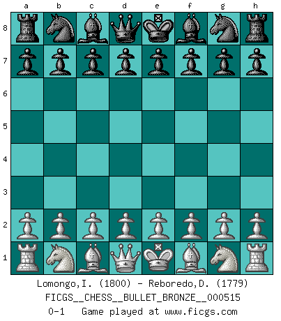 Last move : 0-1 2011 March 27 13:52:32 [Event "FICGS__CHESS__BULLET_BRONZE__000515"] [Site "FICGS"] [Date "2011.03.27"] [Round "1"] [White "Lomongo,Ivan Job"] [Black "Reboredo,Daniel"] [Result "0-1"] [WhiteElo "1800"] [BlackElo "1779"] 0-1 This chess game has been lost on time (started : 2011.03.27 5:34:46) Player Black won this chess game. Follow this game move after move (download)Bobby just drops the pieces and they fall on the right squares. (Miguel Najdorf) Ivan Sokolov treibt mich als Beifahrer an mit go Loeky go - . (Loek van Wely) Personalmente, yo prefiero mirar hacia el futuro en donde un programa de computadora gane el título mundial de Ajedrez. La humanidad necesita una lección de humildad. (Richard Dawkings) Je ne suis pas le dernier à jouer lâchement des coups douteux pendant le zeïtnot de l'adversaire pour l'achever: en effet les coups qui font le plus peur sont ceux que l'on ne comprend pas. Je me fais souvent peur quand je joue. (Un professeur anonyme) There are lots of people who mistake their imagination for their memory. (Josh Bilings)