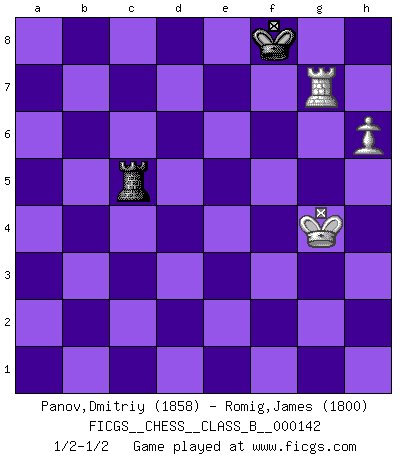 Last move : 1/2-1/2 2011 May 3 10:0:43 [Event "FICGS__CHESS__CLASS_B__000142"] [Site "FICGS"] [Date "2011.03.27"] [Round "1"] [White "Panov,Dmitriy"] [Black "Romig,James"] [Result "1/2-1/2"] [WhiteElo "1858"] [BlackElo "1800"] 1.e4 e5 2.Nf3 Nc6 3.Bc4 Nf6 4.d3 h6 5.O-O Bc5 6.c3 d6 7.b4 Bb6 8.a4 a6 9.Nbd2 O-O 10.a5 Ba7 11.h3 Re8 12.Re1 Nh5 13.Nf1 Qf6 14.Ra2 Be6 15.Bxe6 Qxe6 16.Rb2 Nf6 17.c4 Bd4 18.Nxd4 exd4 19.Qe2 Qd7 20.Qd2 Qe7 21.Ng3 d5 22.Nf5 Qe6 23.b5 axb5 24.Nxg7 Kxg7 25.Qxh6+ Kg8 26.Qg5+ Kh8 27.cxd5 Nxd5 28.Qh5+ Kg7 29.Rxb5 Ncb4 30.Bb2 Qg6 31.Bxd4+ f6 32.Rxd5 Qxh5 33.Rxh5 Nc2 34.Rc1 Nxd4 35.Rxc7+ Kg8 36.Rxb7 Ne2+ 37.Kh2 Nf4 38.R5h7 Rxa5 39.Rbg7+ Kf8 40.Rd7 Kg8 41.Rhg7+ Kh8 42.Rgf7 Ra3 43.d4 Ra2 44.Rh7+ Kg8 45.Rdg7+ Kf8 46.Rf7+ Kg8 47.Rhg7+ Kh8 48.Rg4 Rxf2 49.Rxf6 Rxg2+ 50.Rxg2 Nxg2 51.Kxg2 Rxe4 52.Rd6 Kg7 53.Kf3 Rh4 54.Kg3 Re4 55.h4 Kf7 56.d5 Re5 57.Kf4 Rh5 58.Kg4 Re5 59.Rd7+ Ke8 60.Rg7 Rxd5 61.h5 Rc5 62.h6 Kf8 1/2-1/2 Two knights defense (Modern Bishop's Opening) Kingside Castling by player White (move 5) Kingside Castling by player Black (move 9) 10 pieces endgame at move 49 : White KRRPPP , Black KRRN WHITE : King + 2 Rooks 3 Pawns BLACK : King + 2 Rooks 1 Knight 9 pieces endgame at move 50 : White KRRPPP , Black KRN WHITE : King + 2 Rooks 3 Pawns BLACK : King + 1 Rook 1 Knight 8 pieces endgame at move 50 : White KRPPP , Black KRN WHITE : King + 1 Rook 3 Pawns BLACK : King + 1 Rook 1 Knight 7 pieces endgame at move 51 : White KRPPP , Black KR WHITE : King + 1 Rook 3 Pawns BLACK : King + 1 Rook 6 pieces endgame at move 51 : White KRPP , Black KR WHITE : King + 1 Rook 2 Pawns BLACK : King + 1 Rook 5 pieces endgame at move 60 : White KRP , Black KR WHITE : King + 1 Rook 1 Pawn BLACK : King + 1 Rook This chess game ended in a draw. Follow this game move after move (download)Chess is a beautiful mistress. (Bent Larsen) Woher wissen wir, daß der Neanderthaler Blindschach gespielt hat? -- Bei Ausgrabungen wurden keine Schachbretter und Figuren gefunden. (Anonymous) Aquellos que dicen que entienden al Ajedrez, no entienden nada. (Robert Hubner) Si je n'étais pas joueur d'échecs, je serais le meilleur dans quelque chose d'autre. (Anatoli Karpov) The Internet is the first thing that humanity has build that humanity doesn't understand, the largest experiment in anarchy that we have ever had. (Eric Schmidt)