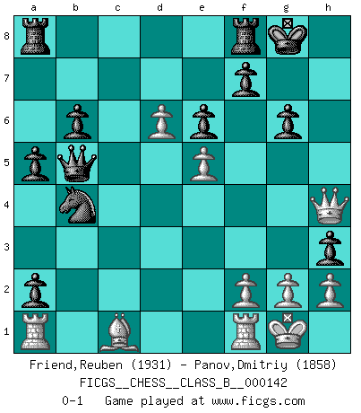Last move : 0-1 2011 May 16 15:4:36 [Event "FICGS__CHESS__CLASS_B__000142"] [Site "FICGS"] [Date "2011.03.27"] [Round "1"] [White "Friend,Reuben"] [Black "Panov,Dmitriy"] [Result "0-1"] [WhiteElo "1931"] [BlackElo "1858"] 1.d4 Nf6 2.Nf3 e6 3.c4 Bb4+ 4.Nbd2 O-O 5.e3 b6 6.Bd3 Bb7 7.O-O d5 8.a3 Be7 9.cxd5 Qxd5 10.b4 c5 11.e4 Qd7 12.e5 Nd5 13.Ne4 cxb4 14.Nfg5 g6 15.Qg4 h5 16.Qg3 Nc6 17.Nf3 bxa3 18.Nd6 Bxd6 19.exd6 Ndb4 20.Ne5 h4 21.Qe3 Nxe5 22.dxe5 a2 23.Be4 a5 24.Qf4 Bxe4 25.Qxe4 h3 26.Qh4 Qb5 0-1 Queen's pawn game Kingside Castling by player Black (move 4) Kingside Castling by player White (move 7) Player Black won this chess game. Follow this game move after move (download)Many Chess players were surprised when after the game, Fischer quietly explained: 'I had already analyzed this possibility' in a position which I thought was not possible to foresee from the opening. (Mikhail Tal) Matt entspricht nicht immer den Tatsachen. (Savielly Grigorievitsch Tartakower) Cada Peón es potencialmente una Reina. (James Mason) La tactique est l'élément le plus important du milieu de jeu. (Siegbert Tarrasch) Over-the-board chess is the favorite of mortals, correspondence chess is the favorite of the gods. (Eduard Dyckhoff)