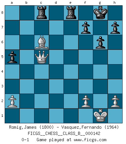 Last move : 0-1 2011 December 25 17:19:52 [Event "FICGS__CHESS__CLASS_B__000142"] [Site "FICGS"] [Date "2011.03.27"] [Round "1"] [White "Romig,James"] [Black "Vasquez,Fernando"] [Result "0-1"] [WhiteElo "1800"] [BlackElo "1964"] 1.e4 e5 2.Nc3 Nc6 3.Nf3 Nf6 4.Nd5 Nxe4 5.d4 exd4 6.Bd3 Nc5 7.O-O Ne7 8.Qe2 Ne6 9.Nf4 Nc6 10.Re1 Bb4 11.c3 dxc3 12.Nd5 cxb2 13.Bxb2 Kf8 14.Nxb4 Nxb4 15.Bc4 Nc6 16.Ne5 Nxe5 17.Qxe5 d6 18.Qc3 Qf6 19.Qb3 Qg5 20.Rac1 Nc5 21.Qf3 Qf5 22.Qc3 Rg8 23.Ba3 b6 24.Bxc5 bxc5 25.Qa5 g6 26.Re3 Qd7 27.Rce1 Qd8 28.Re8+ Qxe8 29.Rxe8+ Kxe8 30.Qxc7 Be6 31.Bb5+ Kf8 32.Qxd6+ Kg7 33.Qe5+ Kh6 34.g4 Bxg4 35.Qf4+ Kg7 36.Qxg4 a5 37.Qh3 Rgd8 38.Qc3+ Kg8 39.Qxc5 Rac8 40.Bc6 Re8 0-1 Vienna game, Max Lange defense Kingside Castling by player White (move 7) Player Black won this chess game. Follow this game move after move (download)It's just you and your opponent at the board and you're trying to prove something. (Bobby Fischer) Korrekt heißt in Deutschland die Haltung eines Mannes, dessen Benehmen nach dem Urteile seiner Nachbarn seiner Stellung angemessen ist. Um korrekt zu sein, muß man sich der Meinung der anderen anpassen... (Emanuel Lasker) Los tropiezos estan todos ahí en el tablero, esperando que se cometan. (Savielly Tartakover) La solitude du joueur d'Echecs à l'approche du mat est semblable à celle du condamné. (Francis Szpiner) Whatever you do, don't be bored. This is absolutely the most exciting time we could have possibly hoped to be alive. And things are just starting. (From movie Waking life)