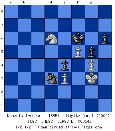 Last move : 1/2-1/2 2011 April 3 12:15:47 [Event "FICGS__CHESS__CLASS_B__000142"] [Site "FICGS"] [Date "2011.03.27"] [Round "1"] [White "Kasznia,Ireneusz"] [Black "Magitz,Aaral"] [Result "1/2-1/2"] [WhiteElo "1855"] [BlackElo "2000"] 1.d4 d5 2.c4 c6 3.e3 Nf6 4.Nf3 Bf5 5.Bd3 Bxd3 6.Qxd3 e6 7.Nc3 Bb4 8.O-O O-O 9.Bd2 Qb6 10.Na4 Qa5 11.Nc5 Bxd2 12.Qxd2 Qxd2 13.Nxd2 b6 14.Nd3 Ne4 15.Nxe4 dxe4 16.Nf4 Nd7 17.Rfd1 g5 18.Ne2 f5 19.h3 Kf7 20.f4 h6 21.Kf2 a5 22.Rg1 Nf6 23.g3 a4 24.b4 axb3 25.axb3 b5 26.Rgb1 Rfb8 27.d5 exd5 28.cxb5 cxb5 29.Nd4 Kg6 30.Nc6 Rxa1 31.Rxa1 Rb7 32.b4 d4 33.Nxd4 Nd5 34.Ra6+ Rb6 35.Rxb6+ Nxb6 36.g4 fxg4 37.f5+ Kf6 38.hxg4 Nd5 39.Nxb5 Nxb4 40.Nd6 Nd3+ 41.Kg3 1/2-1/2 QGD Slav defense Kingside Castling by player White (move 8) Kingside Castling by player Black (move 8) 10 pieces endgame at move 39 : White KNPPP , Black KNPPP WHITE : King + 1 Knight 3 Pawns BLACK : King + 1 Knight 3 Pawns This chess game ended in a draw. Follow this game move after move (download)It is always better to sacrifice your opponent's men. (Savielly Tartakower) Obwohl ich alt bin, darf mir niemand den Finger in den Mund stecken, sonst beisse ich. (Wilhelm Steinitz) Bendita sea la memoria de aquel que dio al mundo este juego inmortal. (A. G. Gardiner) On n'a jamais que l'âge auquel on a commence à jouer aux échecs car après on cesse de vieillir. (Capablanca) Nowadays, anyone who cannot speak English and is incapable of using the Internet is regarded as backward. (Al-Waleed bin Talal)