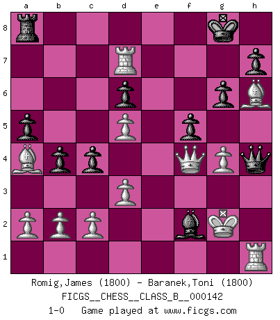 Last move : 1-0 2011 June 14 19:45:38 [Event "FICGS__CHESS__CLASS_B__000142"] [Site "FICGS"] [Date "2011.03.27"] [Round "1"] [White "Romig,James"] [Black "Baranek,Toni"] [Result "1-0"] [WhiteElo "1800"] [BlackElo "1800"] 1.e4 c5 2.Nf3 g6 3.Bc4 Nc6 4.O-O Bg7 5.Re1 d6 6.d3 Nf6 7.h3 O-O 8.Nc3 a6 9.Bg5 b5 10.Bb3 b4 11.Nd5 Nxd5 12.exd5 Nd4 13.Bxe7 Qc7 14.Nxd4 Bxd4 15.Bxf8 Bxh3 16.Bh6 Bf5 17.Rb1 a5 18.Ba4 c4 19.g4 Bd7 20.Re7 Qd8 21.Rxd7 Qf6 22.Qd2 Qh4 23.Qf4 Bxf2+ 24.Kg2 f5 25.Rh1 1-0 Sicilian : Hungarian variation Kingside Castling by player White (move 4) Kingside Castling by player Black (move 7) Player White won this chess game. Follow this game move after move (download)The battle for the ultimate truth will never be won. And that's why Chess is so fascinating. (Hans Kmoch) Bobby Fischer ist kein Vorbild für die heutige Jugend. (Viktor Kortschnoi) Ciertamente el estado mental actual de Bobby Fischer es una tragedia. Uno de los mas grandes jugadores de Ajedrez del mundo -el orgullo y pena del Ajedrez Americano. (Frank Brady) Botvinnik disait en comparant les échecs à la musique: Il existe une science dont le but est l'étude de l'acoustique et des sons. Mais il y a aussi un art qui se sert de l'océan des sons : c'est la musique. De toute évidence, il en est de même pour la pensée. La logique est l'étude des lois de la réflexion et les échecs reflètent, en tant qu'art, le côté logique de la réflexion, sous la forme d'images artistiques... Extrait de Fischer - Spassky, Reykjavik 1972 par Alexander & F. Wyndham (Ed. Solar), p 37. You must have a dream in order to have it come true. (A.P.J. Kalam)