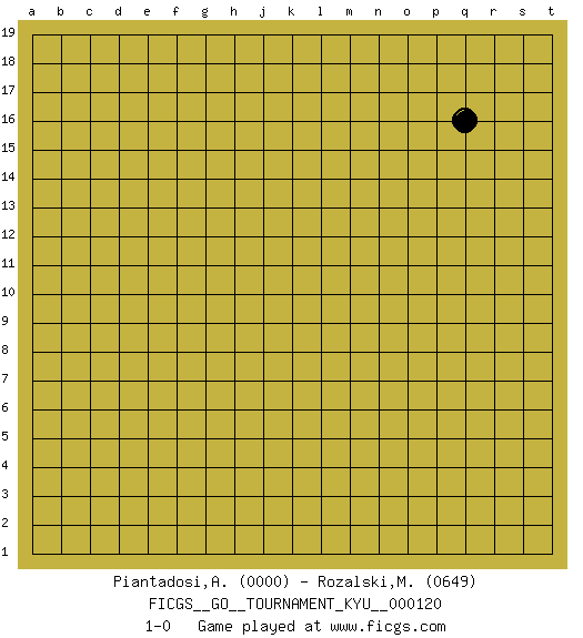 Last move : 1-0 2011 May 3 17:26:18 [Event "FICGS__GO__TOURNAMENT_KYU__000120"] [Site "FICGS"] [Date "2011.03.31"] [Round "1"] [Black "Piantadosi,Angelo"] [White "Rozalski,Maciej"] [Result "1-0"] [Rating 1 "0000"] [Rating 2 "0649"] 1.q16 1-0 This go game has been lost on time (started : 2011.03.31 18:5:38) Here are the names of the openings (joseki) played in the four corners : Player Black won this Go (weiqi, baduk) game. Follow this game move after move (download)Beginner's games are surprising, often incoherent and incomprehensible. When you improve, your game gains in consistency but flirts with stupidity: you become satisfied with truisms and mechanical movements, you try to obtain a feeling for clearness and style the easy way. (Pierre Audouard) When a man with money meets a man with experience, the man with experience leaves with money and the man with money leaves with experience. (Anonymous)