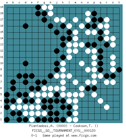 Last move : 0-1 2011 November 19 7:19:36 [Event "FICGS__GO__TOURNAMENT_KYU__000120"] [Site "FICGS"] [Date "2011.03.31"] [Round "1"] [Black "Piantadosi,Angelo"] [White "Cookson,Timothy"] [Result "0-1"] [Rating 1 "0000"] 1.d16 q16 2.d4 q4 3.d10 f3 4.h3 e5 5.e4 j17 6.g17 f4 7.d5 d6 8.e6 f5 9.d7 c6 10.c5 e7 11.f6 c7 12.d8 g6 13.f7 h5 14.e8 m3 15.j4 k6 16.j5 j6 17.l3 m2 18.l2 l4 19.k4 g2 20.h2 h1 21.j1 b5 22.b4 e3 23.b6 d3 24.a5 m17 25.q10 q8 26.o8 p9 27.o10 o9 28.n9 n8 29.p8 n10 30.m9 p10 31.o11 p11 32.n11 o7 33.n7 p7 34.m8 l5 35.o8 o12 36.m10 m12 37.n12 n13 38.m11 l12 39.j12 k10 40.k11 l11 41.l10 k9 42.k8 j8 43.j9 l8 44.h8 k7 45.j10 m14 46.j15 l1 47.g1 k2 48.k3 n6 49.m6 m4 50.j2 s9 51.q9 p12 52.q11 s11 53.q12 q13 54.l9 k8 55.l15 m15 56.k14 l16 57.k16 k17 58.h16 c3 59.c8 c4 60.b7 h18 61.g18 g19 62.f19 h19 63.f18 m1 64.k1 r17 65.g3 f2 66.h4 p5 67.l6 k5 68.g7 b3 69.a3 a2 70.a4 r3 71.o6 n5 72.l7 m5 73.n8 m7 74.b2 b1 75.a1 c1 76.c2 d2 77.d1 e1 78.c1 h6 79.g4 g5 80.h1 p15 81.l14 l13 82.k13 m13 83.f1 e2 84.r13 r14 85.q14 s13 86.p13 s14 87.o13 p8 88.r8 r7 89.s8 s7 90.p6 n10 91.t9 s10 92.q15 r15 93.p16 o15 94.q17 r16 95.o16 n16 96.p18 o17 97.p17 o18 0-1 Here are the names of the openings (joseki) played in the four corners : Corner d4 : d4 f3 Hoshi (Hwajeom, Seongjeom, Xingwei`) 4-4 Point. The star or hoshi (4-4) point, emphasizing influence at the potential expense of territory. Ikken Kakari (Hankan Keolch'im, Yi Gua`jiao~, 1-Space Low Approach). White 2 is the standard approach move to the 4-4. Corner d16 : d16 j17 Hoshi (Hwajeom, Seongjeom, Xingwei`) 4-4 Point. The star or hoshi (4-4) point, emphasizing influence at the potential expense of territory. Player White won this Go (weiqi, baduk) game. Follow this game move after move (download)The possibility or impossibility of an event results logically from the rules. (Pierre Audouard) Opportunities multiply as they are seized. (Sun Tzu)