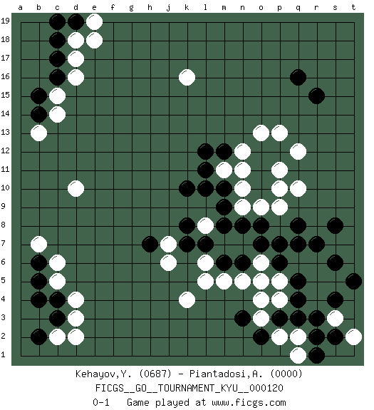 Last move : 0-1 2011 October 8 23:39:54 [Event "FICGS__GO__TOURNAMENT_KYU__000120"] [Site "FICGS"] [Date "2011.03.31"] [Round "1"] [Black "Kehayov,Yulian"] [White "Piantadosi,Angelo"] [Result "0-1"] [Rating 1 "0687"] [Rating 2 "0000"] 1.r15 d16 2.q4 d4 3.q16 q10 4.r3 r6 5.q8 q6 6.p6 p5 7.q5 o5 8.p7 p9 9.r7 r5 10.s6 s5 11.s8 r4 12.q3 s3 13.s2 t2 14.r1 p4 15.p3 o3 16.q7 o6 17.o7 n7 18.o8 o9 19.n8 m7 20.m8 l8 21.m9 p2 22.t5 q2 23.r2 q1 24.s4 k16 25.o2 k4 26.n11 p13 27.l10 n10 28.o11 p11 29.p12 q12 30.o12 m11 31.m10 o13 32.o10 n9 33.k10 n12 34.m12 p10 35.l11 n11 36.l12 d10 37.c17 d17 38.c16 c15 39.b15 c14 40.b14 b13 41.c18 d18 42.d19 e19 43.c19 e18 44.c3 d3 45.c4 c5 46.b5 c6 47.b6 b7 48.b4 c2 49.b2 d2 50.n3 o4 51.n6 n5 52.m6 m5 53.l7 l5 54.k8 l6 55.k7 j6 56.h7 j7 0-1 This go game has been lost on time (started : 2011.03.31 18:5:38) Here are the names of the openings (joseki) played in the four corners : Corner d16 : d16 c17 Hoshi (Hwajeom, Seongjeom, Xingwei`) 4-4 Point. The star or hoshi (4-4) point, emphasizing influence at the potential expense of territory. Corner d4 : d4 c3 Hoshi (Hwajeom, Seongjeom, Xingwei`) 4-4 Point. The star or hoshi (4-4) point, emphasizing influence at the potential expense of territory. Player White won this Go (weiqi, baduk) game. Follow this game move after move (download)In the corner, five stones in a row on the third line are alive. (Anonymous) Humor is by far the most significant activity of the human brain. (Edward De Bono)
