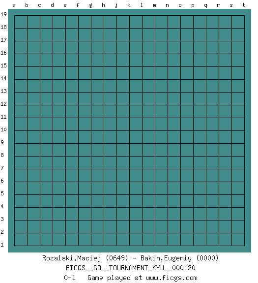 Last move : 0-1 2011 May 2 17:12:28 [Event "FICGS__GO__TOURNAMENT_KYU__000120"] [Site "FICGS"] [Date "2011.03.31"] [Round "1"] [Black "Rozalski,Maciej"] [White "Bakin,Eugeniy"] [Result "0-1"] [Rating 1 "0649"] [Rating 2 "0000"] 0-1 This go game has been lost on time (started : 2011.03.31 18:5:38) Here are the names of the openings (joseki) played in the four corners : Player White won this Go (weiqi, baduk) game. Follow this game move after move (download)Atari, atari is vulgar play. (Anonymous) Empty your mind, be formless, shapeless — like water. (Bruce Lee)