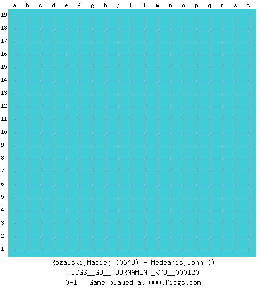 Last move : 0-1 2011 May 2 17:12:28 [Event "FICGS__GO__TOURNAMENT_KYU__000120"] [Site "FICGS"] [Date "2011.03.31"] [Round "1"] [Black "Rozalski,Maciej"] [White "Medearis,John"] [Result "0-1"] [Rating 1 "0649"] 0-1 This go game has been lost on time (started : 2011.03.31 18:5:38) Here are the names of the openings (joseki) played in the four corners : Player White won this Go (weiqi, baduk) game. Follow this game move after move (download)Go is to western chess what philosophy is to double entry accounting. (from Shibumi, by Trevanian) Warrior pose battles inner weakness and wins focus. You see that there is no war within you. You're on your own side, and you are your own strength. (Terri Guillemets)