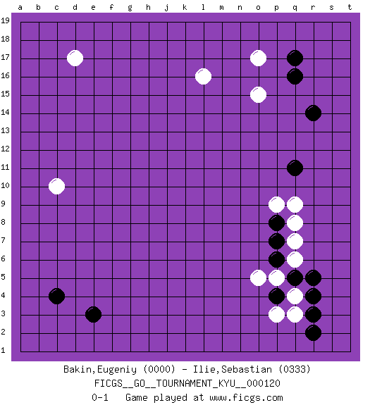 Last move : 0-1 2011 May 30 6:59:30 [Event "FICGS__GO__TOURNAMENT_KYU__000120"] [Site "FICGS"] [Date "2011.03.31"] [Round "1"] [Black "Bakin,Eugeniy"] [White "Ilie,Sebastian"] [Result "0-1"] [Rating 1 "0000"] [Rating 2 "0333"] 1.q16 d17 2.c4 q3 3.e3 o17 4.r14 l16 5.q17 o15 6.q11 c10 7.r5 q7 8.p4 q4 9.q5 p5 10.p6 o5 11.p7 q8 12.p8 q9 13.r4 q6 14.r3 p3 15.r2 p9 0-1 This go game has been lost on time (started : 2011.03.31 18:5:38) Here are the names of the openings (joseki) played in the four corners : Corner q16 : q16 o17 Hoshi (Hwajeom, Seongjeom, Xingwei`) 4-4 Point. The star or hoshi (4-4) point, emphasizing influence at the potential expense of territory. Ikken Kakari (Hankan Keolch'im, Yi Gua`jiao~, 1-Space Low Approach). White 2 is the standard approach move to the 4-4. Corner q4 : q3 r5 Komoku (Somok, Xiao~mu`) 3-4 Point. The komoku (3-4) point is the traditional corner enclosure move.. Ikken Kakari (Hankan Keolch'im, Yi Gua`jiao~, 1-Space Low Pincer). The small knight move is the basic approach move to the 3-4 point stone. It has been continually used for over four centuries. There are limitless variations, with new moves constantly being discovered. Black 2 opens the door to a treaure store of joseki. Player White won this Go (weiqi, baduk) game. Follow this game move after move (download)The nature of a game comes from what is played, but it's the sensitivity to the possible and the impossible that gives it value. (Pierre Audouard) Always be a first-rate version of yourself, instead of a second-rate version of somebody else. (Judy Garland)